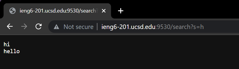 The method that is called is handleRequest with path /search?s=hi or /search?s=h. Nothing else in the class is modified, the values from the HashSet are simply retreived. The program compiles a list of all the words in the HashSet that contain “hi” in the first example and “h” in the second example. This isn’t case sensitive!