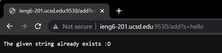 You can’t add repeats! The method that is called is handleRequest with path /add?s=hi or /add?s=hello. The HashSet in the class is modified since “hi” and “hello” are added to it. Previously, the HashSet was empty.